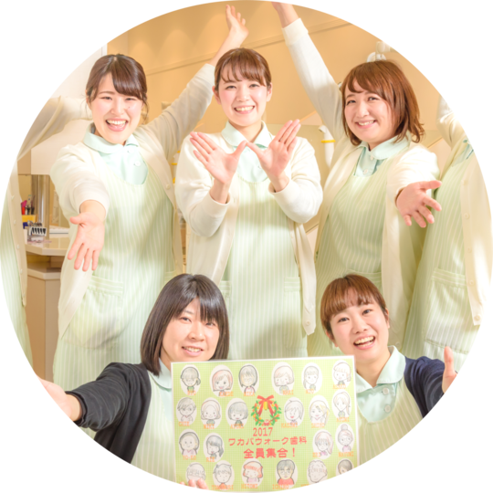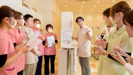 歯科医師も、歯科衛生士も、歯科助手も、お互いの仕事を認め合い、協力し合って診療を進めています。20代から50代まで、幅広い年代のスタッフが在籍していますが、みんな仲良く協力し合って仕事をしています。